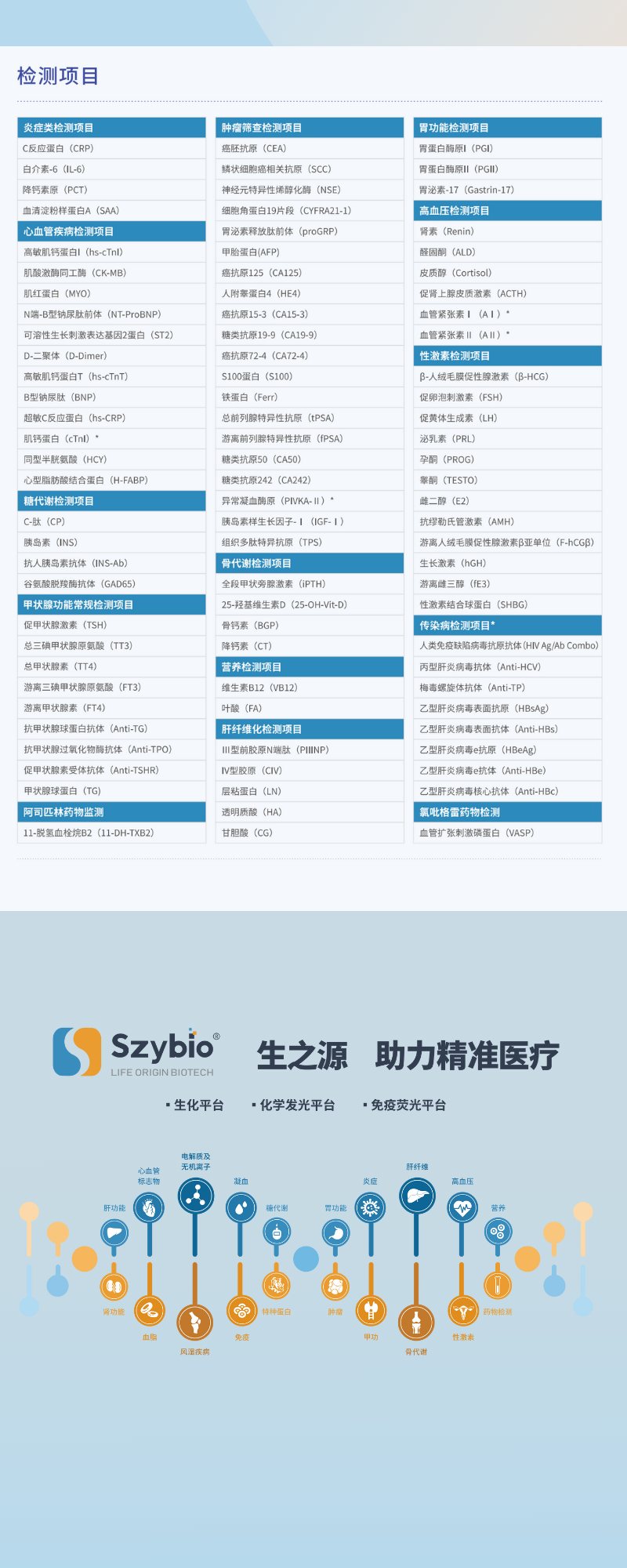 武漢生之源工業(yè)原料事業(yè)部可提供單克隆抗體、多克隆抗體、診斷蛋白、生化酶、分子生物學(xué)產(chǎn)品以及相關(guān)定制服務(wù)。產(chǎn)品全面覆蓋炎癥標(biāo)志物、心肌標(biāo)志物、腫瘤標(biāo)志物、肝功腎功、甲功激素、自身免疫疾病、呼吸道病原體、動(dòng)物傳染病等領(lǐng)域;廣泛應(yīng)用于免疫比濁、免疫層析、酶聯(lián)免疫、化學(xué)發(fā)光、臨床生化和分子診斷等平臺(tái)。